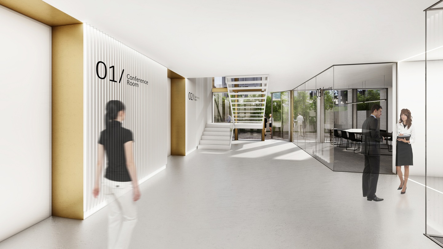 - niveau RDJ : locaux communs : hall d'accueil, salle de conférence, réunion, convivialité + laboratoires MECA + locaux techniques