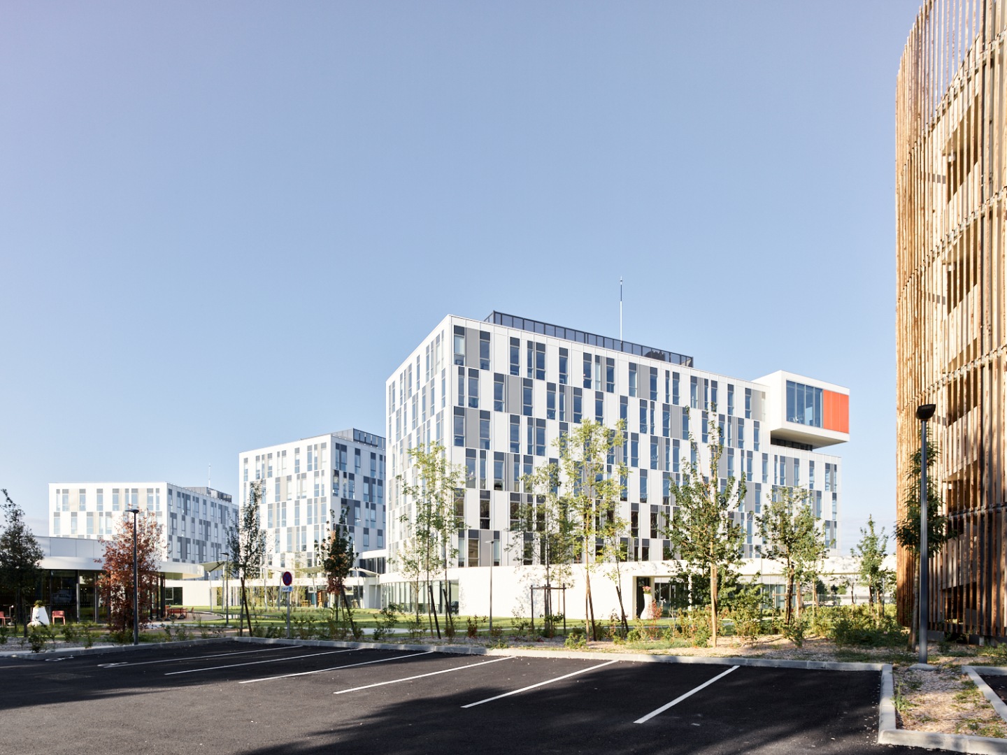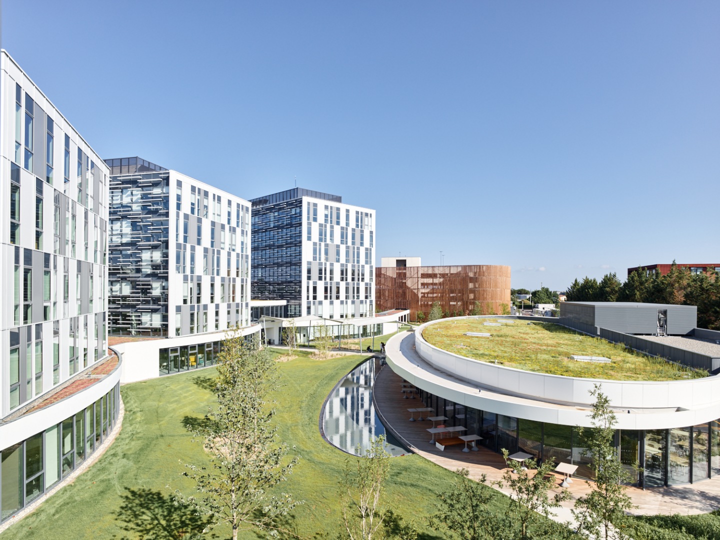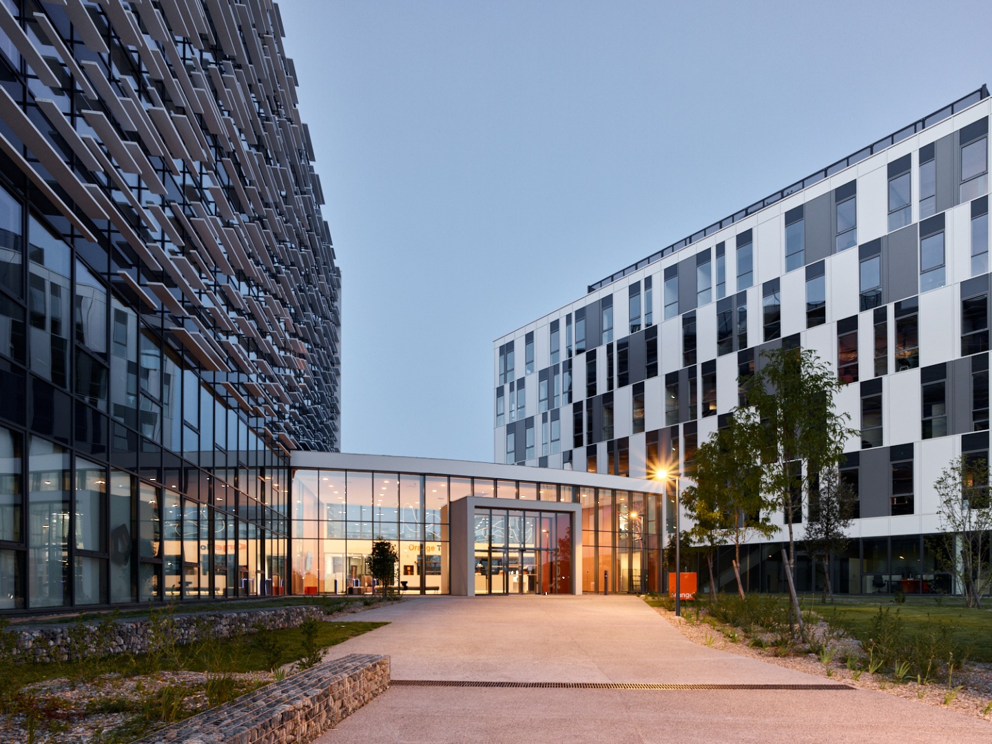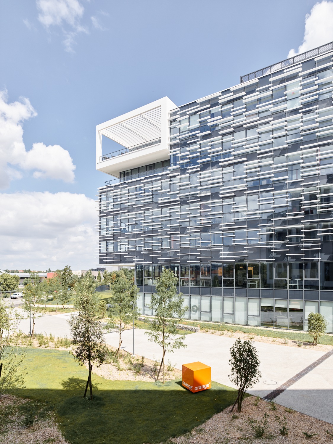 Construction du Campus ORANGE Tolosa à Balma (31) : bureaux, restaurant d'entreprise, parking silo de 646 places et 140 emplacements vélos.
